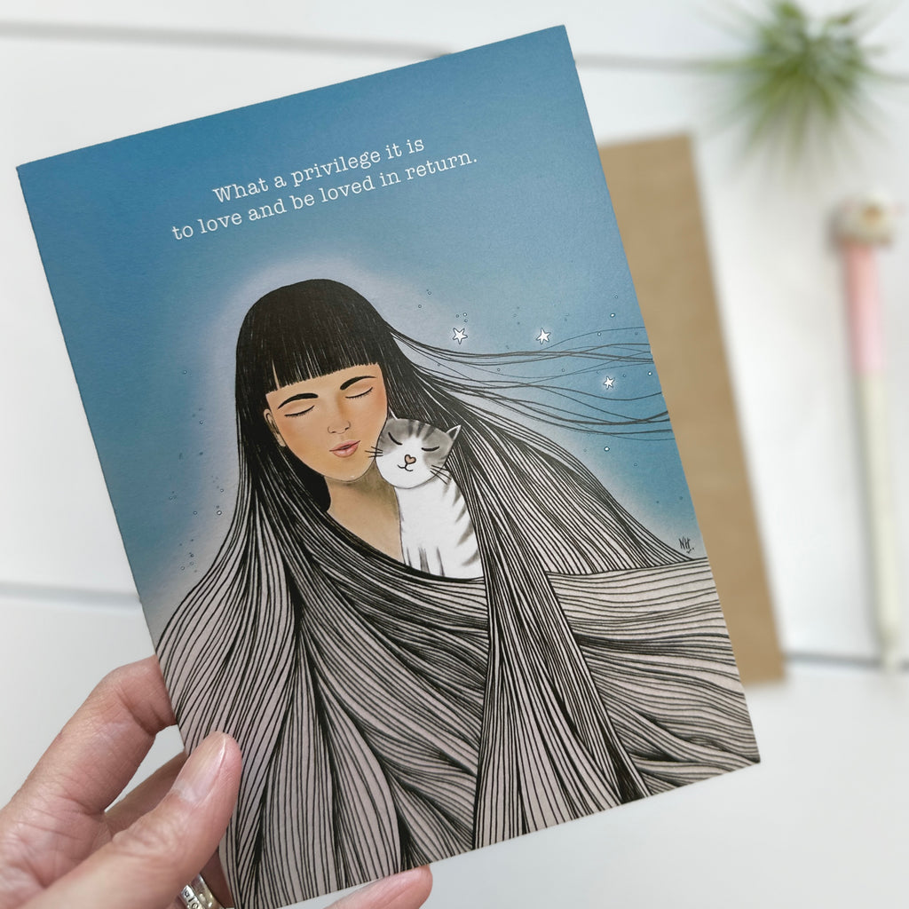 Celebrate the profound joy of connection with this elegant greeting card, featuring a tender illustration of a girl cradling a cat. The accompanying sentiment—"What a privilege it is to love and be loved in return"—captures the essence of meaningful relationships and the quiet beauty found in companionship. Perfect for expressing affection to someone special, whether acknowledging a cherished bond, offering comfort, or simply reminding them of their worth. A thoughtful choice for any occasion that calls for heartfelt words.